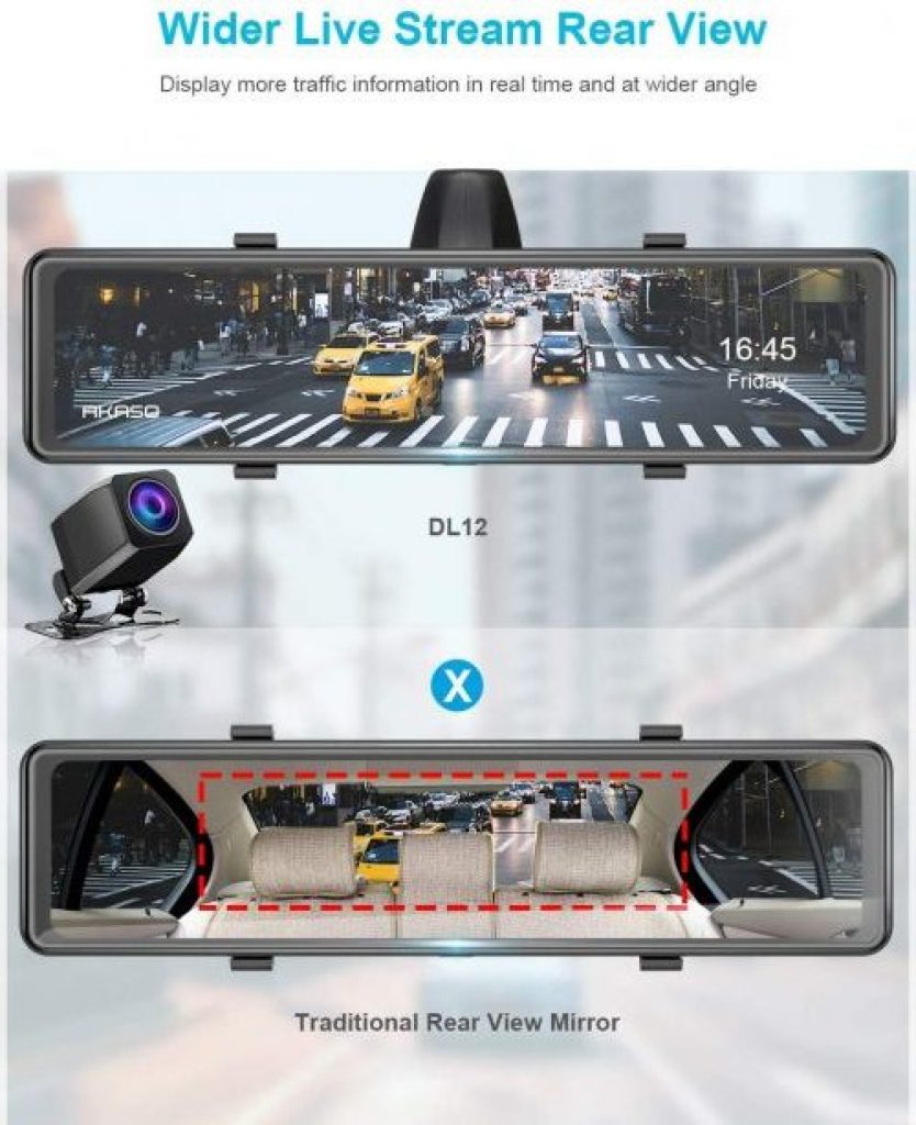 Akaso’s DL12 mirror dash cam is a fantastic bit of kit, with plenty of great features. This ultra-slim device boasts a 12″ touchscreen display and a dual dash cam with backup rearview mirror camera setup.