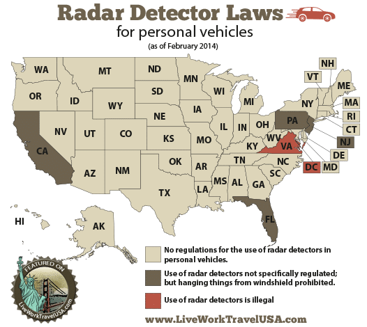 Radar detectors are legal in those states, excluding Virginia. Radar detectors are also prohibited for big trucks in some states like Illinois and New York.